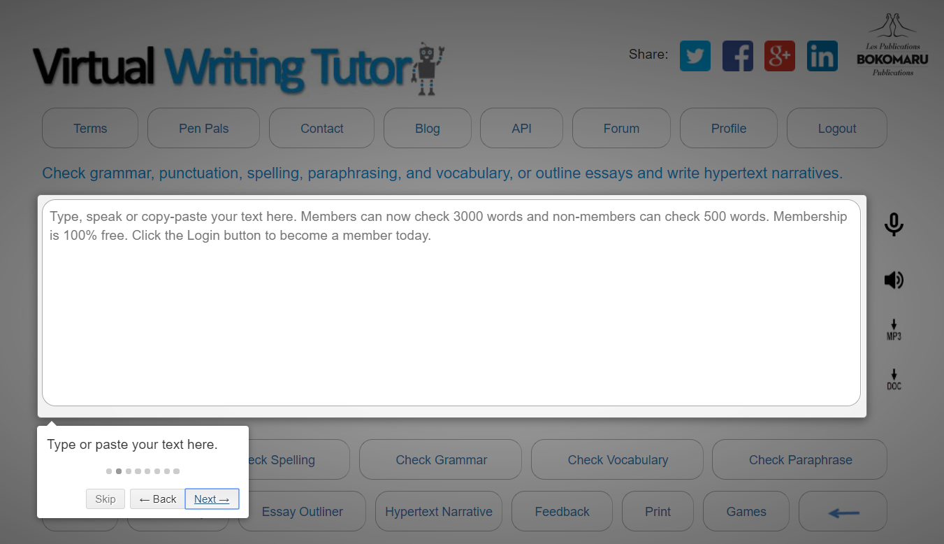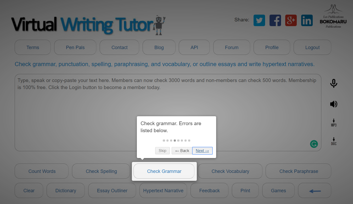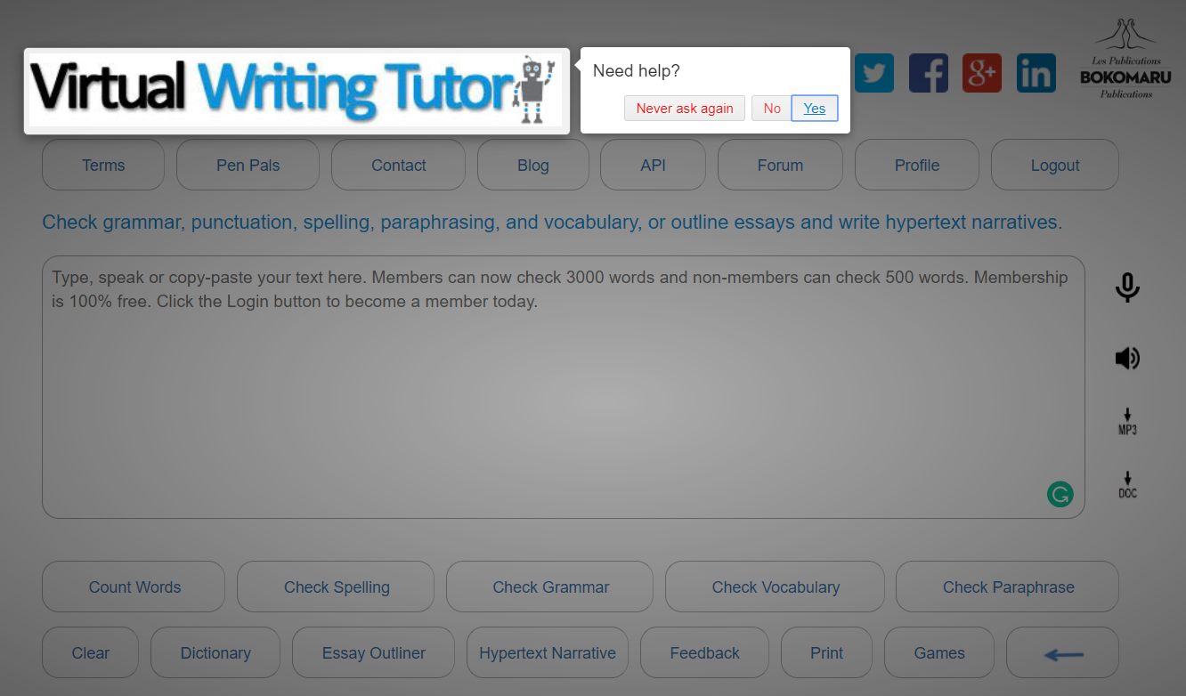 You may have noticed the latest addition to the Virtual Writing Tutor grammar checker main page. It’s a short little walkthrough of the principal features of the grammar checker for newcomers. You only get to see it twice before it disappears forever. Why did we add it?